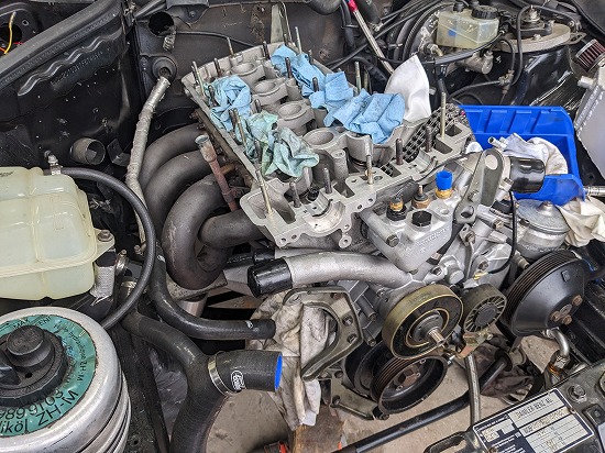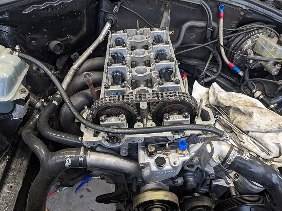 ヘッド載せたら水回りのホース組んでラジエター液入れてこの状態でしばらく放置します。