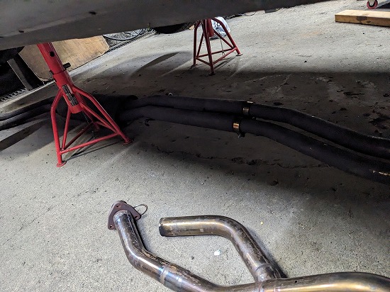 がこの車のマフラーは全部差し込みになっているのでフロントマフラー外すにはリヤマフラーから外さないとなりません。