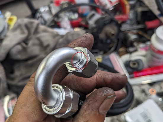 最初来たのがこの赤丸に穴が開いてて燃料噴いちゃうんでキノクニに言って交換してもらう。