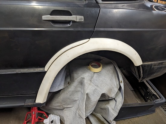 このフェンダーの他にFRPのフロントバンパー、リヤバンパーがあるのでリヤのフェンダーアーチとウィングあればエボに出来るので欲しい人いたら売りますよ。