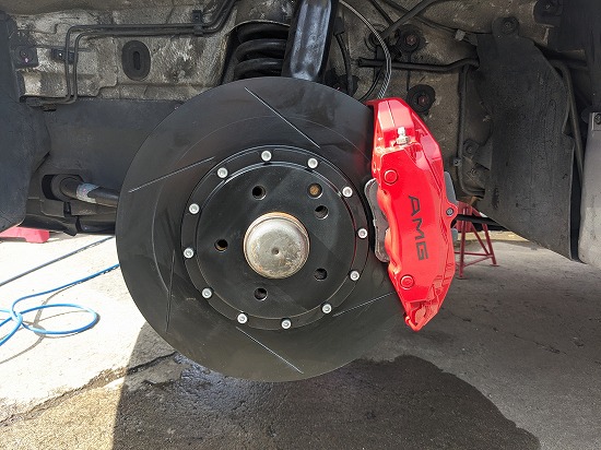 フロントは355mmはほしいところですけどホイールがAMG/17インチなのでこれが限界です。