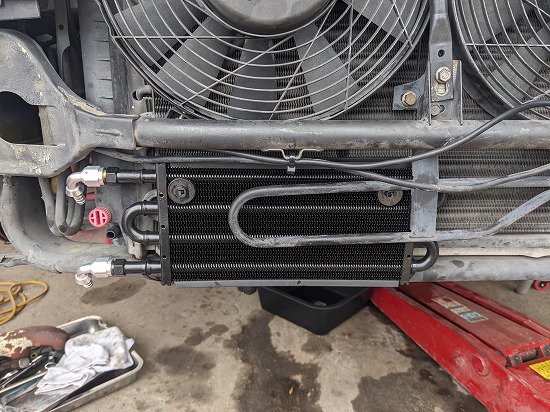 純正ラジエターのサイドタンクの水冷式のオイルクーラーのままですとラジエターが劣化してオイルクラーが割れます。