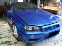 Nくんの愛機34GT-R 左ドアに傷つけられたので今回保険修理で入庫です。
