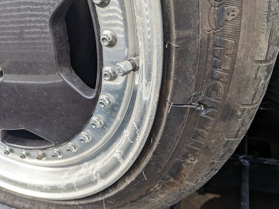 平塚に帰ってきてタイヤにエアー入れたんですが右リヤタイヤが切れてました。