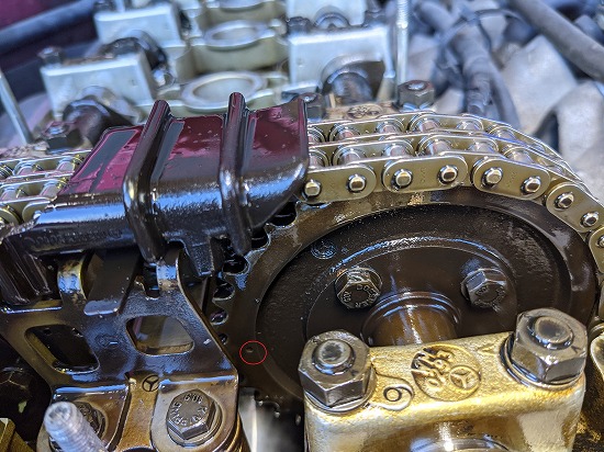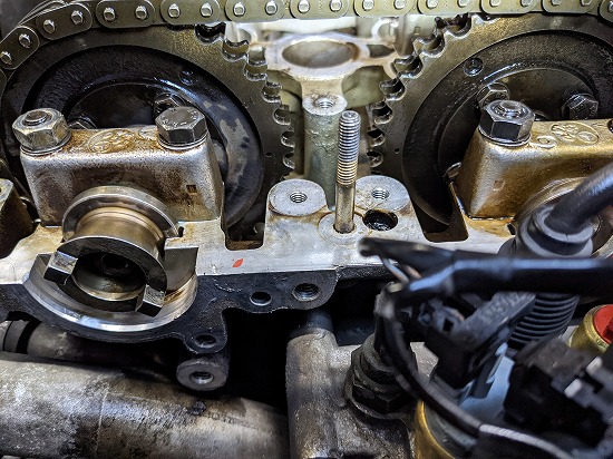 その後カムを取り付けて新しいチェーンテンショナーを取り付けます。