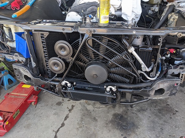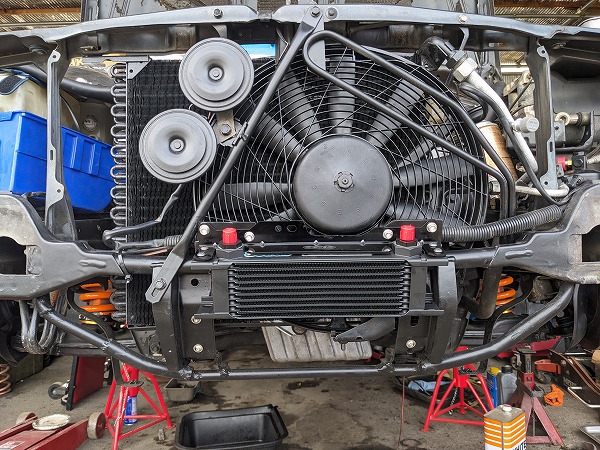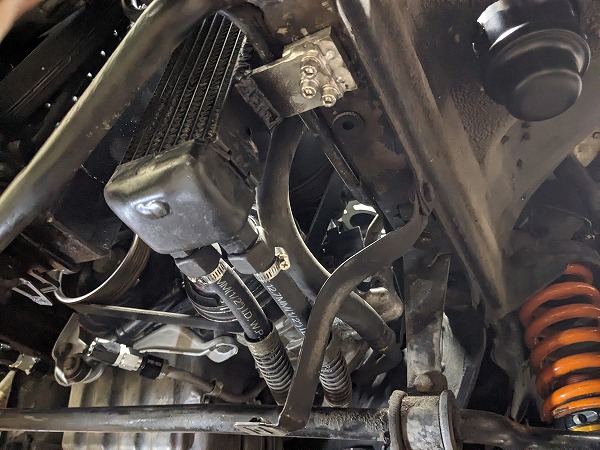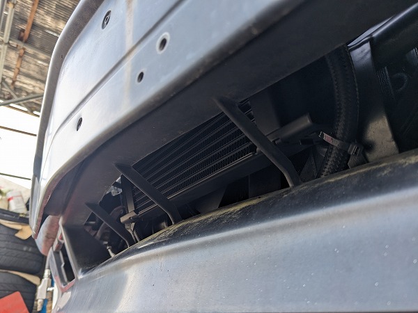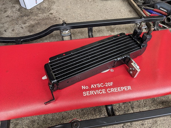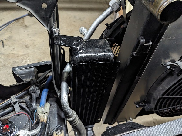 それと純正オイルクーラーがラジエターに取り付けるんだけど前から気に入らなかったんで今回ボディ側に取り付けるようにステー溶接しました。
