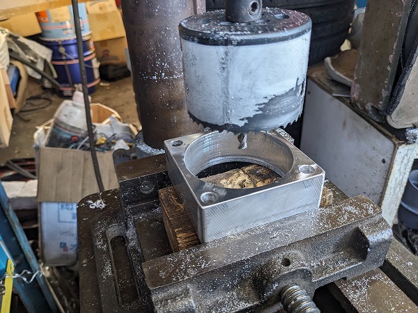 スロットル自体を上げないとスロットルポジションセンサーが付かないので30mmアルミに70パイで穴あけです。