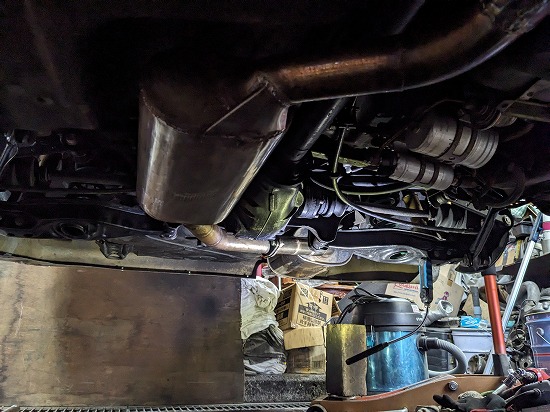 結構ギリギリまで這わせてリヤマフラーとセンターマフラー間にフランジ入れました。