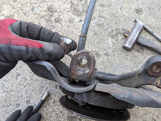 ここタイロッドがのテーパーロッドが入る場所なんですが普通のボルトが入るようにカラーが打ち込んである。
